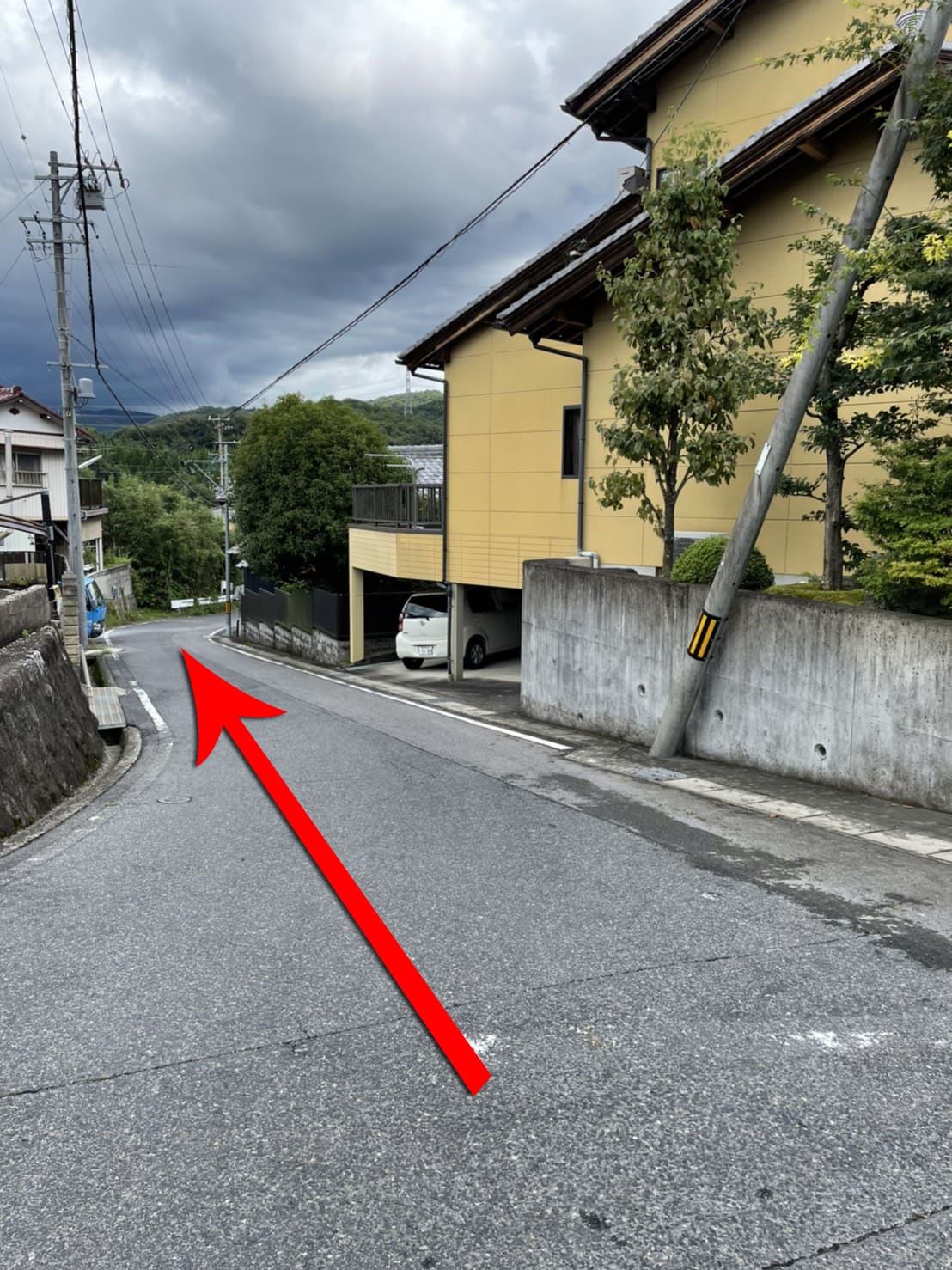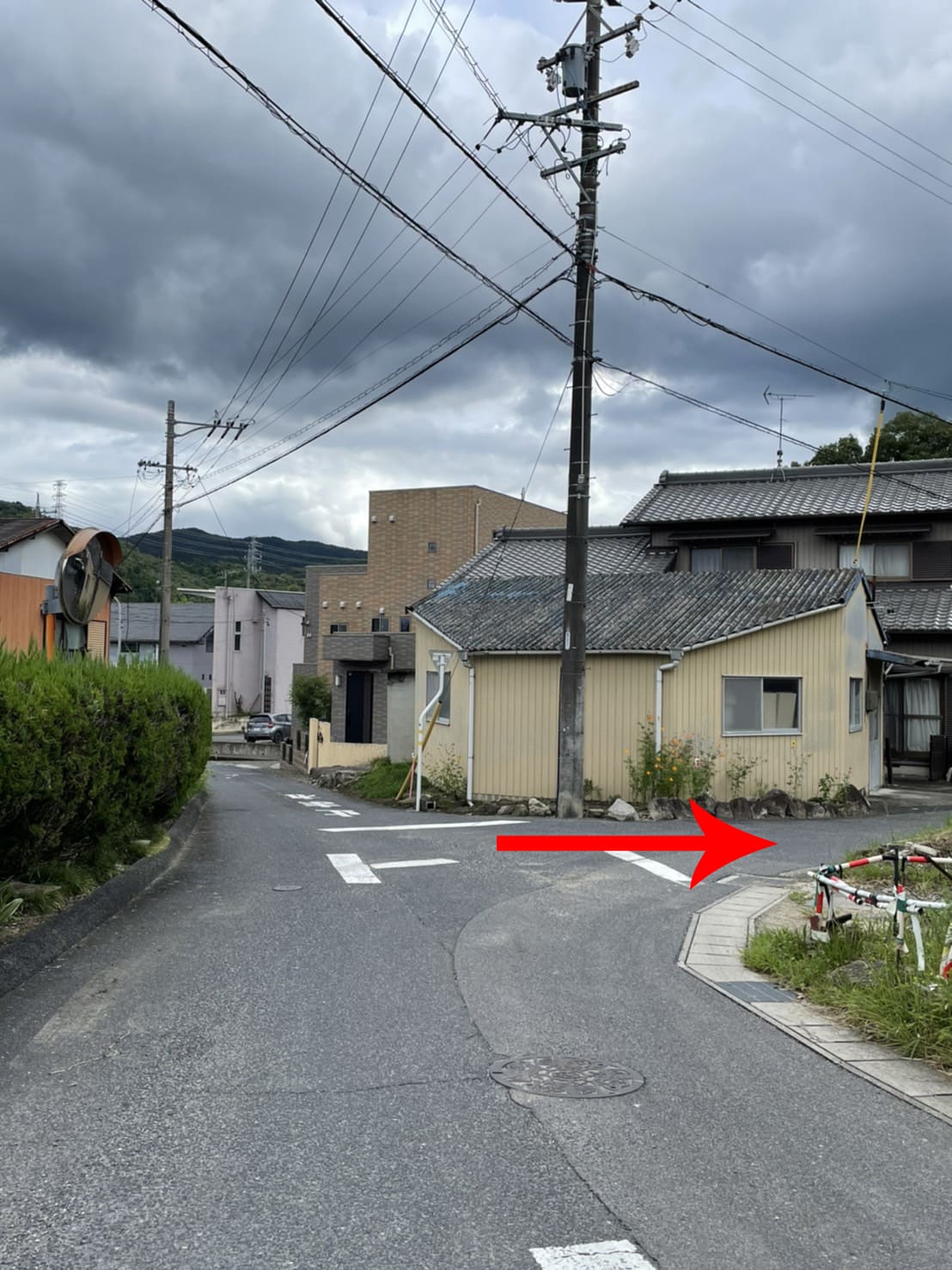 しばらくまっすぐお進みいただきますと、右に曲がる道がありますので、下画像の矢印の方向にお進みください。