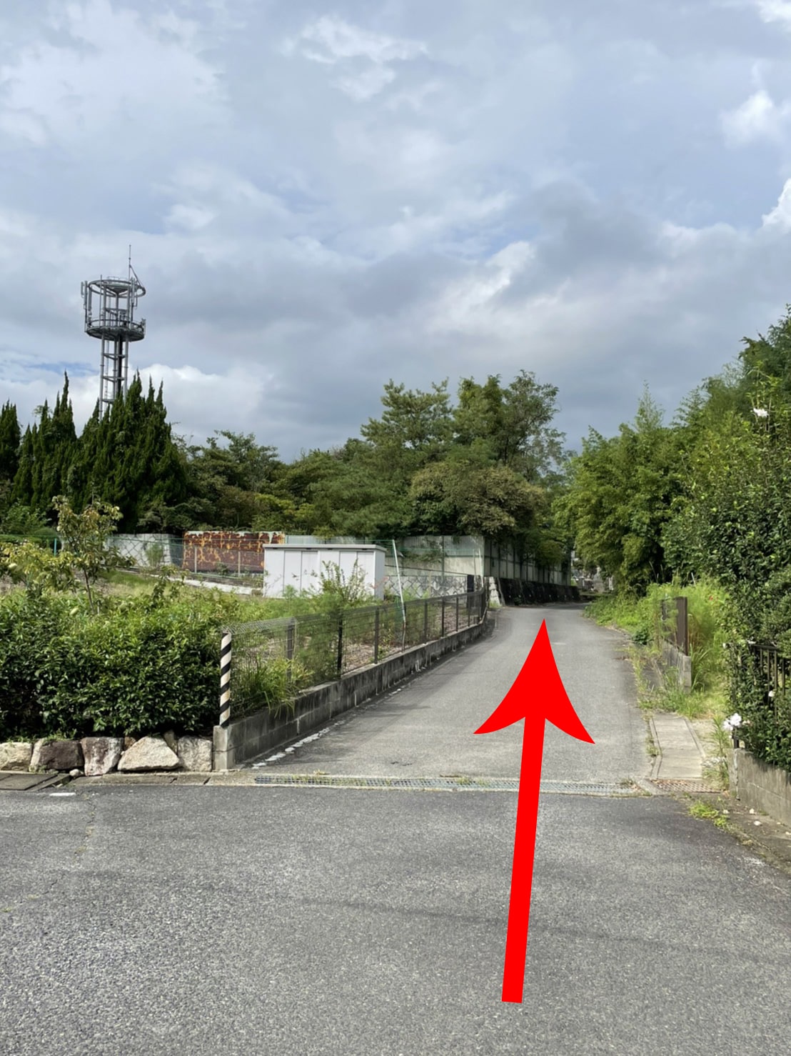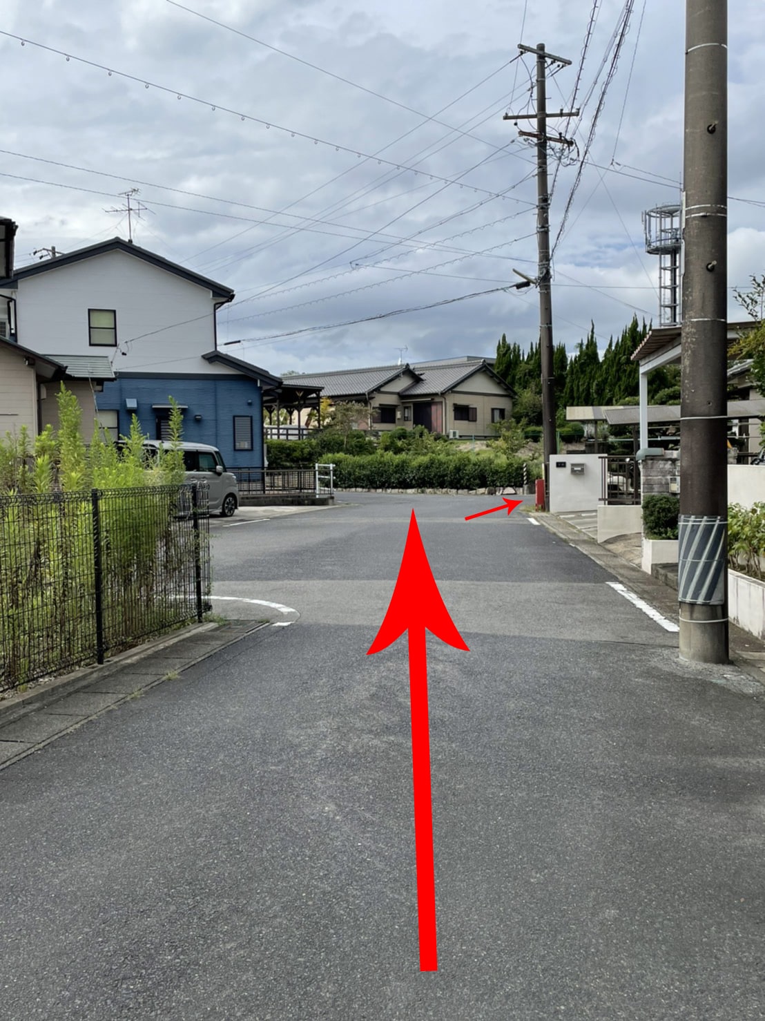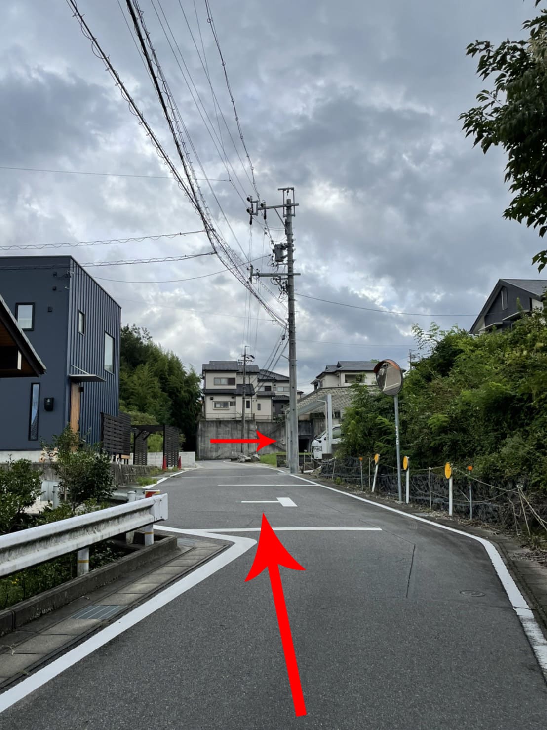 まっすぐお進み頂き、下画像の奥のほうまでお進み頂きますと、右に曲がれます。傾斜のある道を登り切ってください。
