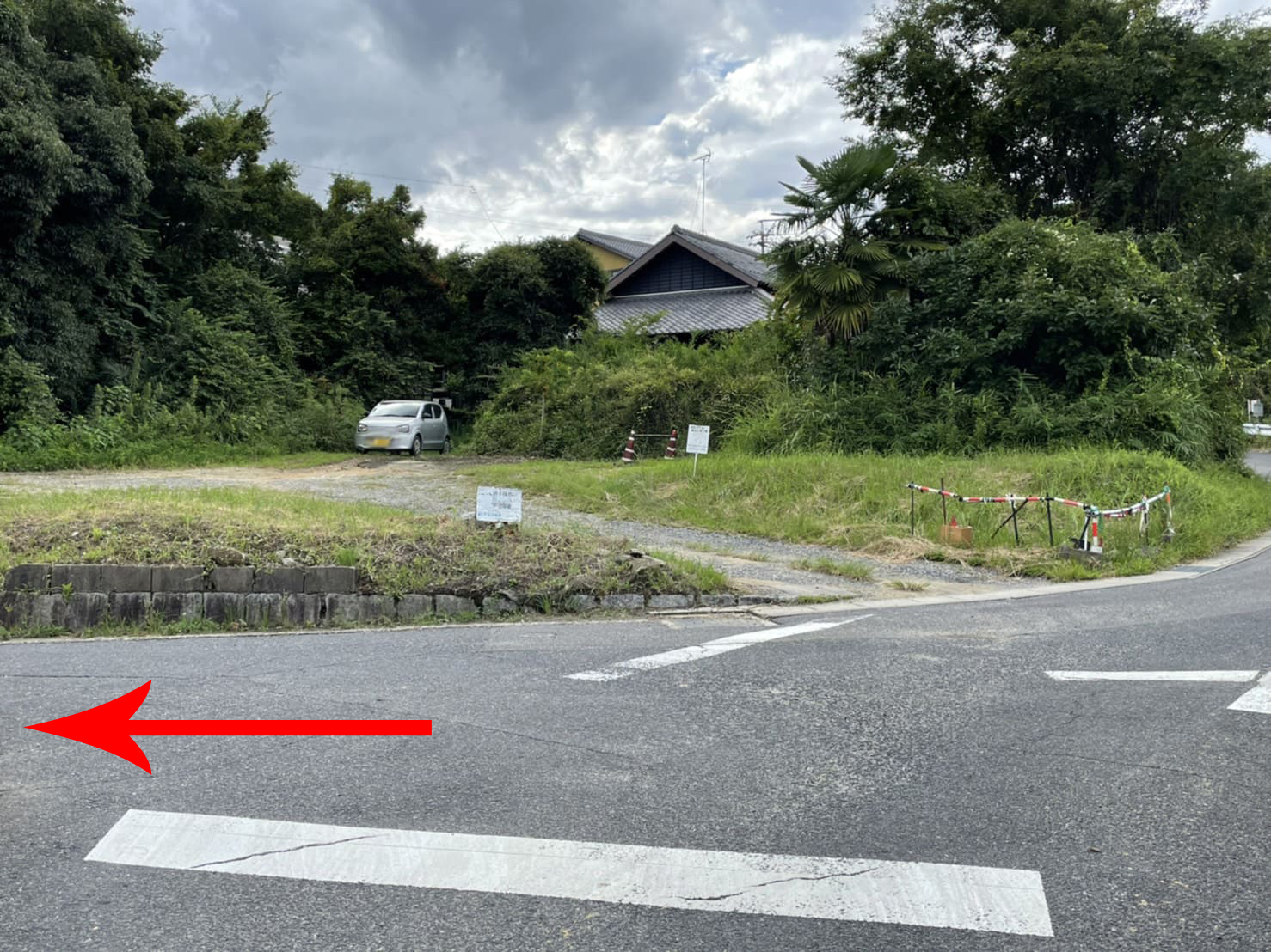 お進みいただきますと左手に墓地が見えてきまして、下り坂になります。右手に見える広場が駐車場です。