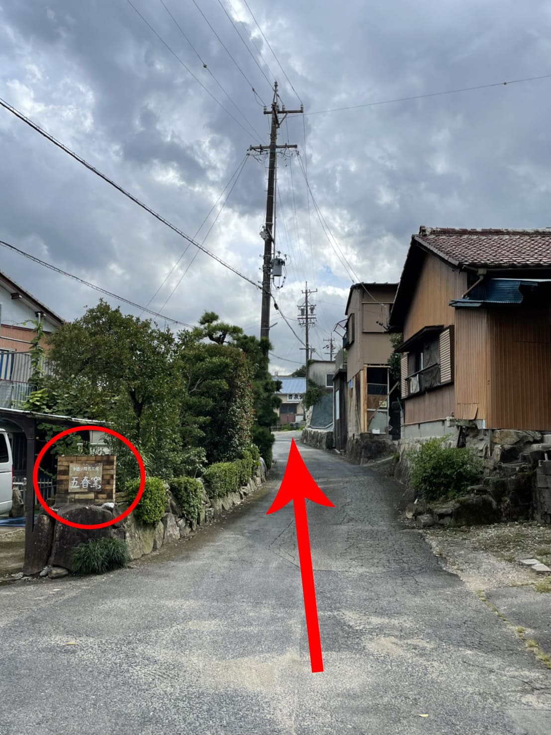 まっすぐ進むと「五春窯」(下画像〇の箇所)という看板が見えてきます。矢印の方向にまっすぐお進みください。