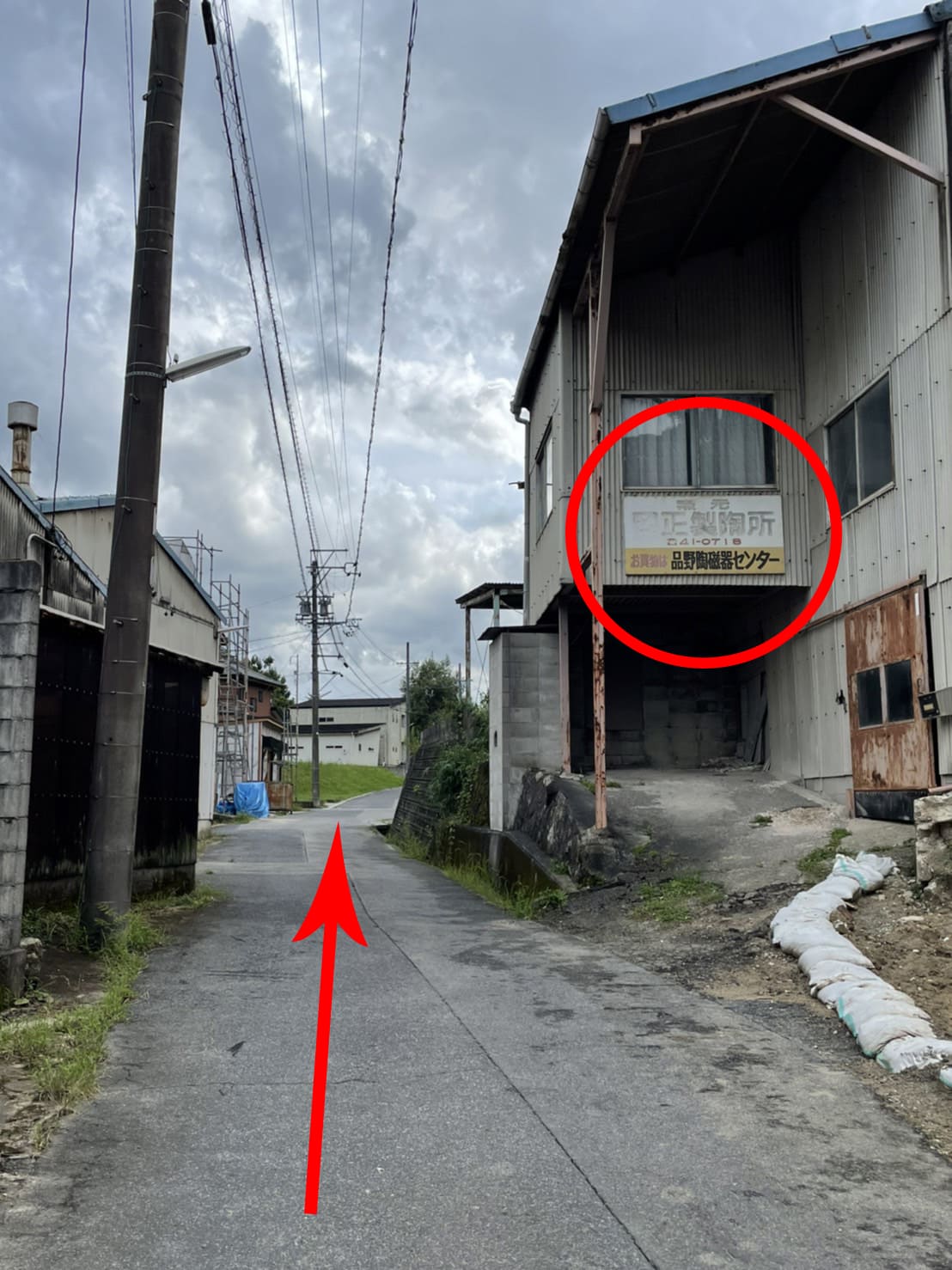 まっすぐ進みますと「岡正製陶所」(下画像〇の箇所)がございます。通り過ぎてまっすぐお進みください。