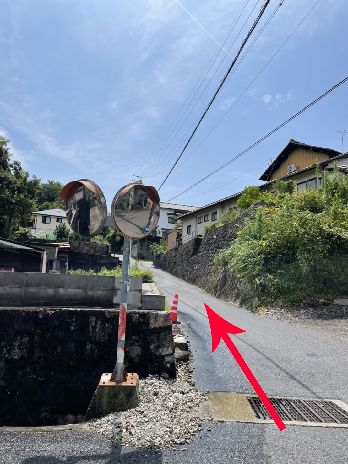 下に降りきるとさらにコンクリートの道が下まで続いておりますので、矢印の方向にお進みください。