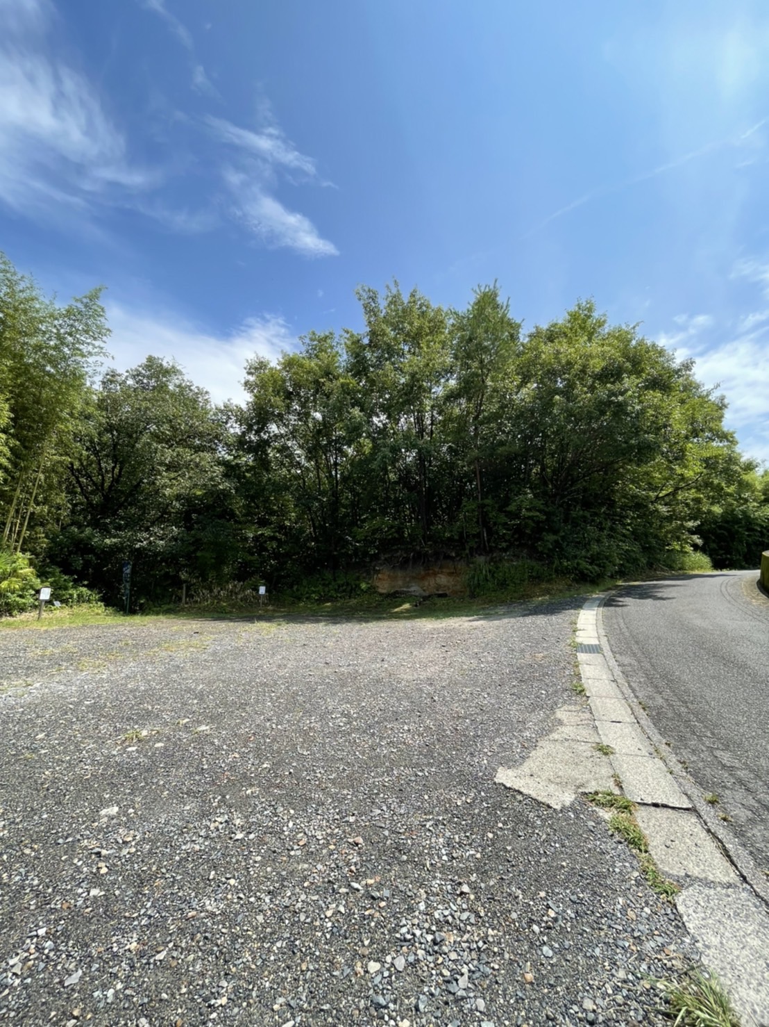 しばらく道なりにまっすぐお進みいただきますと、墓地が前方上方向に見えてまいります。そのまましばらく坂を登って行ってください。墓地を過ぎた頃、左手に広場のような場所が見えます。(下画像参照)こちらの広場が駐車場となります。